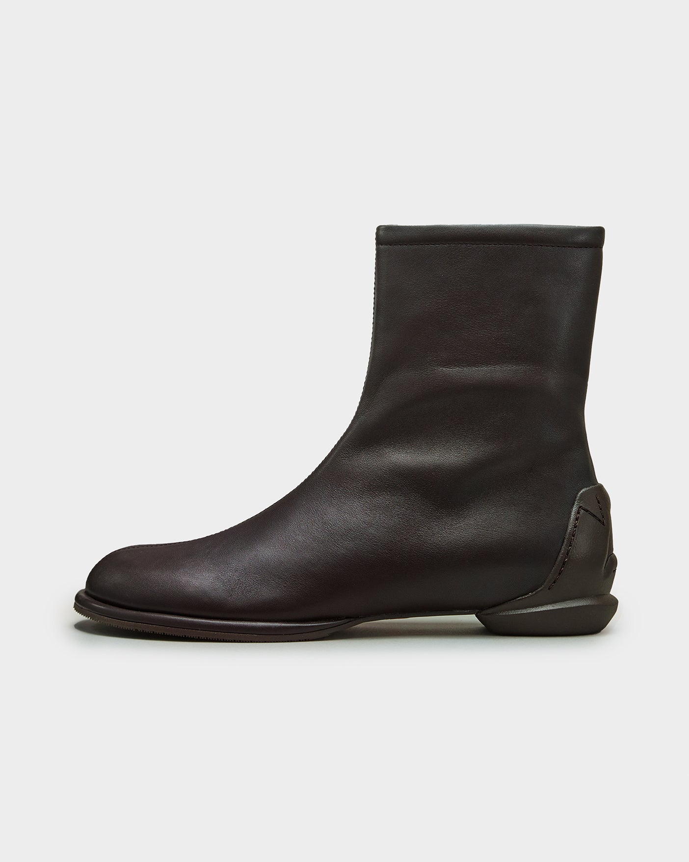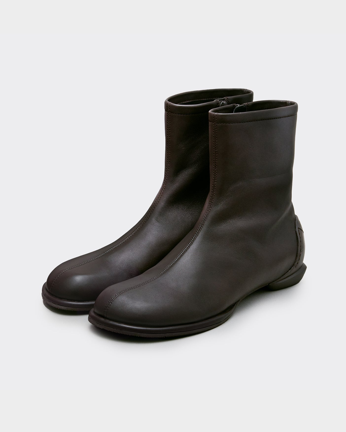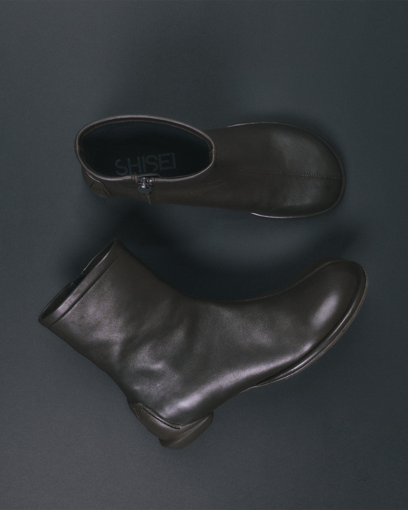 ソックスのような感覚で履く、無駄なデザインを削ぎ落としたショートブーツです。ぽってりとしたつま先の形状とさらにピースで強調させた新鮮なシルエット。シンプルな中に特徴的なバランスを作りました。アッパーは本⾰でありながら、撥⽔機能を持ったシューズです。