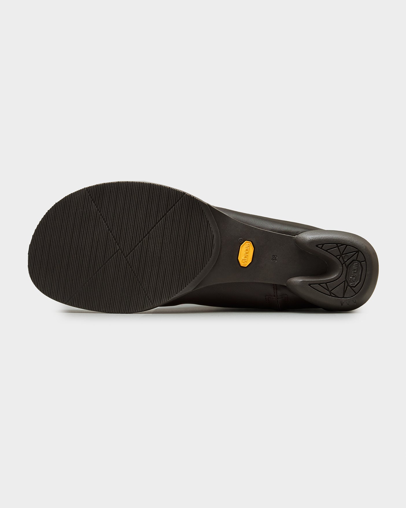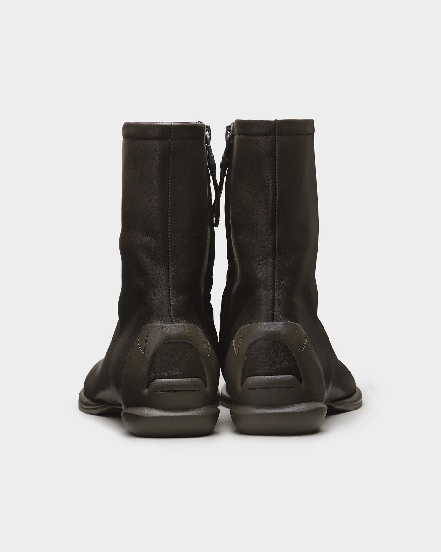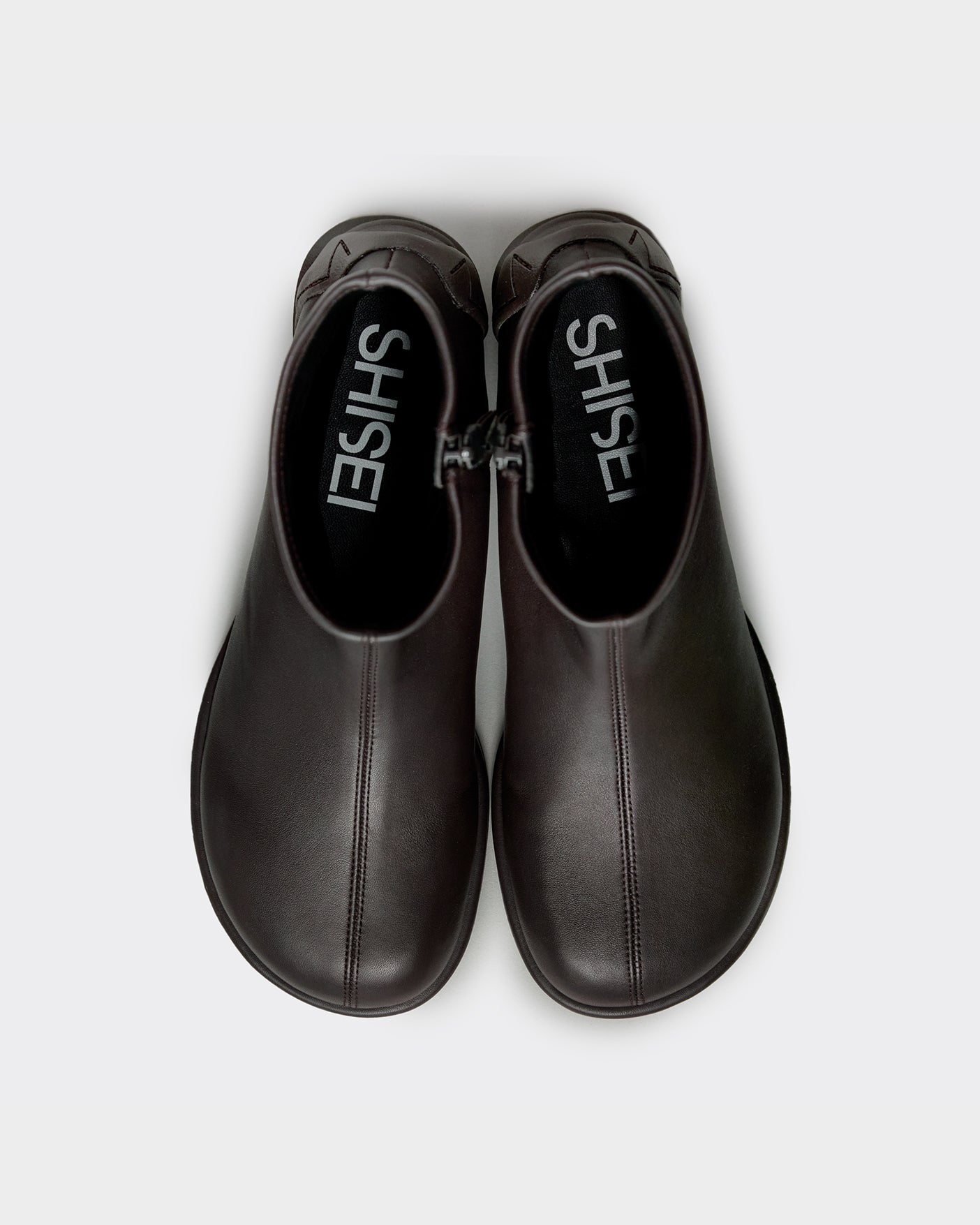 ソックスのような感覚で履く、無駄なデザインを削ぎ落としたショートブーツです。ぽってりとしたつま先の形状とさらにピースで強調させた新鮮なシルエット。シンプルな中に特徴的なバランスを作りました。アッパーは本⾰でありながら、撥⽔機能を持ったシューズです。